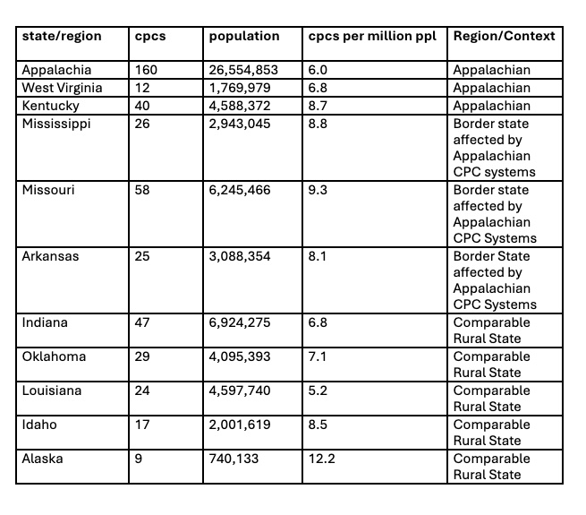 Crisis pregnancy centers are not a deep south problem, not a midwest problem, and not a rural problem. They are a national infrastructure. They show up everywhere, but they grow fastest where care has been stripped away. CPCs thrive in the absence of full-spectrum reproductive healthcare. In places where entire zip codes, counties and even states have been abandoned, leaving CPCs with the space to redefine what care looks like. Their expansion is not accidental. It is the predictable result of policy failure and philanthropic neglect. Additionally, CPC density in Appalachia did not emerge in isolation.