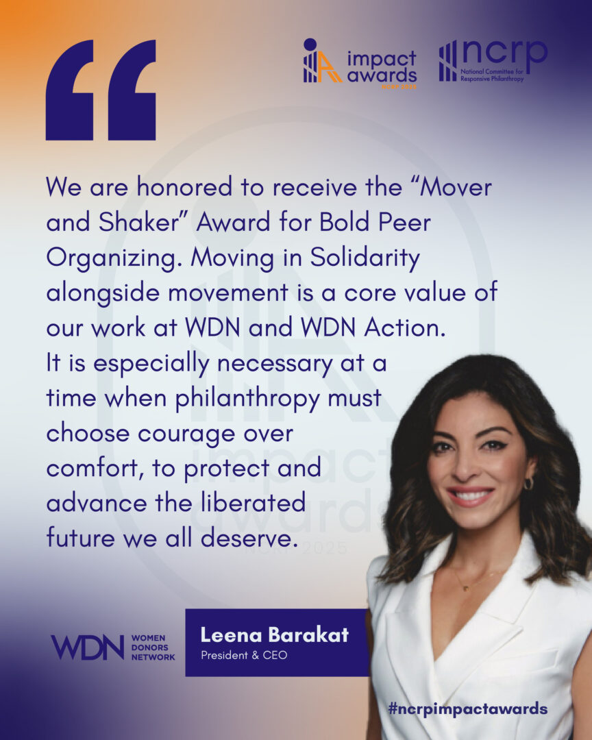 At a time when social justice work is under heightened attack, Women Donors Network (WDN) is being recognized for its bold leadership and values-driven donor advocacy. WDN’s commitment to combining long-term investment in movement building sets them apart as a courageous force in progressive philanthropy. WDN’s model of radical giving invites donors to transform their relationship to power and wealth.